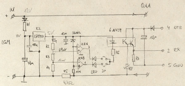 Der Spannungsteiler R2, R3, R4 erzeugt zwei Referenzspannungen von 69 mV und 16 mV. Im Normalfall liegen an R5 32 mV an. Fällt diese Spannung unter 16 mV (Daten vom LGM), schaltet IC1-B gegen Masse. Steigt die Spannung über 69 mV (Daten vom QAA), schaltet IC1-A gegen Masse. Die beiden LED dienen zur optischen Kontrolle. Mit den beiden Jumpern JP kann gewählt werden, welche Daten beobachtet werden sollen. Über R6 wird der Optokoppler 6N139 angesteuert. Die Schaltung ist so angelegt, daß nur während der Datenübertragung Strom durch den Optokoppler fließt. Während der Pausen wird kein Strom verbraucht.