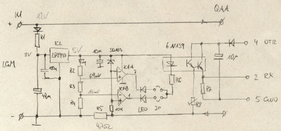 Der Spannungsteiler R2, R3, R4 erzeugt zwei Referenzspannungen von 69 mV und 16 mV. Im Normalfall liegen an R5 32 mV an. Fällt diese Spannung unter 16 mV (Daten vom LGM), schaltet IC1-B gegen Masse. Steigt die Spannung über 69 mV (Daten vom QAA), schaltet IC1-A gegen Masse. Die beiden LED dienen zur optischen Kontrolle. Mit den beiden Jumpern JP kann gewählt werden, welche Daten beobachtet werden sollen. Über R6 wird der Optokoppler 6N139 angesteuert. Die Schaltung ist so angelegt, daß nur während der Datenübertragung Strom durch den Optokoppler fließt. Während der Pausen wird kein Strom verbraucht.