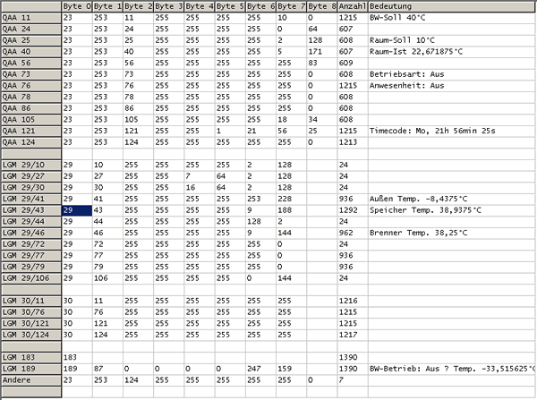 Um rauszufinden, welches Telegramm welche Bedeutung hat, habe ich zunächst während der Aufzeichnung mit dem BASIC-Programm die Daten nach Telegrammtyp sortiert am Bildschirm anzeigen lassen. So konnte man schon mal sehen, an welchen Stellen sich gelegentlich was ändert, z.B. wenn man am Einstellrad des QAA70 dreht.